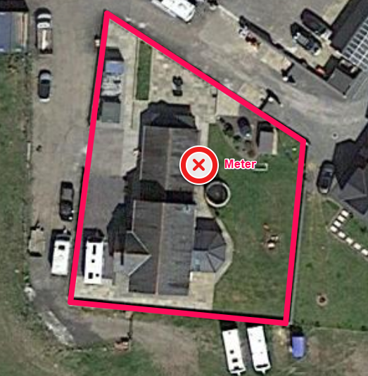 This is an aerial view of the building you will be installing on, marking with an arrow where the meter location is within the building.